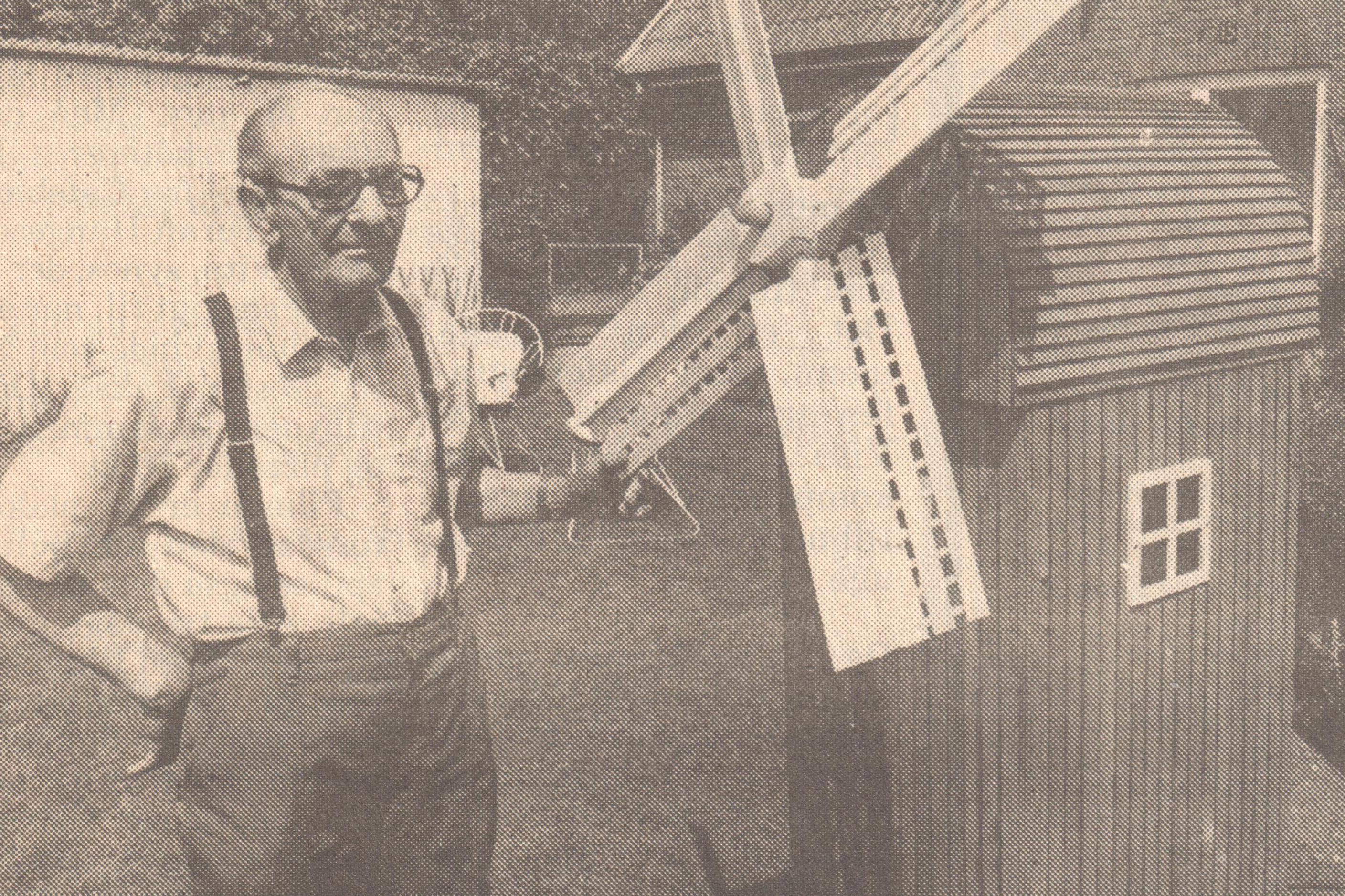 Far Hans Kulle (69 år) i haven i Nyråd med sin selvbyggede stav mølle